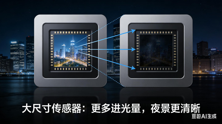 传感器越大,进光量越多,夜景越清晰,细节越丰富。这比像素数量重要得多。